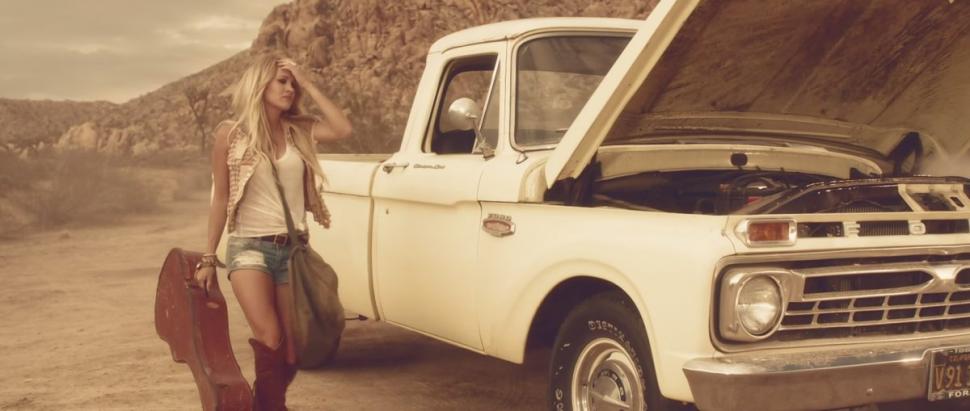Portrait of a young Caucasian female sitting in the driver’s seat of an SUV and looking at the camera, with ocean waves visible in the background. Horizontal format.